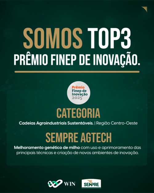 Em cerimônia realizada hoje, dia 08/10/2025, a Sempre conquistou o Top 3 na Categoria Agroindustriais Sustentáveis – Região Centro-Oeste , no Prêmio FINEP de Inovação, uma das principais premiações nacionais de incentivo à pesquisa e desenvolvimento tecnológico.